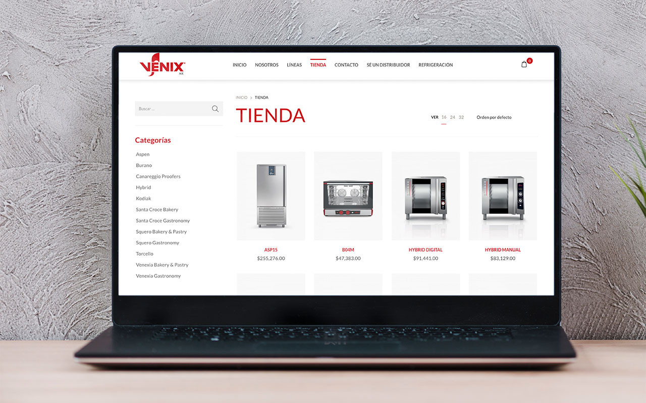 Venix requería un sitio web donde pudieran conocer sus productos y a su vez obtener una cotización o bien, venderlos mediante pago con transferencia o tarjeta de débito o crédito. Para ello realizamos la propuesta de su eCommerce, basándonos en la identidad de su sitio en Italia y ajustando los productos en las categorías seleccionadas para México.